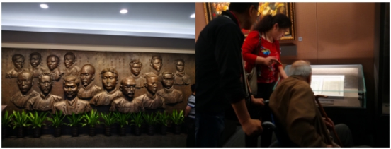 走進(jìn)"一大"會(huì)址,首先映入眼簾的是13位中共代表及2位共產(chǎn)國(guó)際代表銅頭像。他們是毛澤東、何叔衡、董必武、陳潭秋、王盡美、鄧恩銘、李達(dá)、李漢俊、張國(guó)燾、劉仁靜、陳公博、周佛海、包惠僧及荷蘭人馬林和俄羅斯人尼柯爾斯基,左手邊是巨幅黨旗,重溫入黨誓詞,激情澎湃,激蕩回響。忽然,我看見一位老人坐著輪椅被推到成列窗前,旁邊的女子大聲給老人講解并手指相片,可能老人耳朵聽不清,久久凝視,用顫抖的右手撫摸著放照片的成列窗玻璃,張張嘴,笑了。這一場(chǎng)景我的心顫了,我看到老人眼里含著淚笑,而我卻哭了……