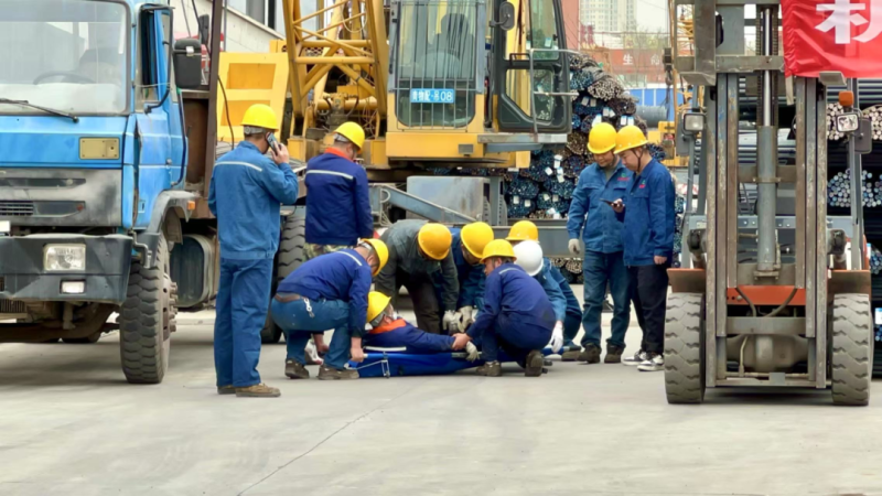 本次演練模擬鋼板區(qū)在進(jìn)行吊裝作業(yè)時(shí)突發(fā)輪胎起重機(jī)吊裝貨物擺幅過大傷人事故。演練前期,制定了詳細(xì)方案并組織培訓(xùn),籌備救援、醫(yī)療等物資,布置模擬場景。演練啟動(dòng)后,通訊聯(lián)絡(luò)組迅速傳遞事故信息,現(xiàn)場指揮組即刻啟動(dòng)應(yīng)急響應(yīng)。警戒疏散組快速隔離現(xiàn)場、疏散人員;應(yīng)急救援組解救受傷人員、排除設(shè)備故障;醫(yī)療救護(hù)組對(duì)傷員緊急救治并送醫(yī);后勤保障組及時(shí)供應(yīng)物資,各環(huán)節(jié)有序推進(jìn)。
