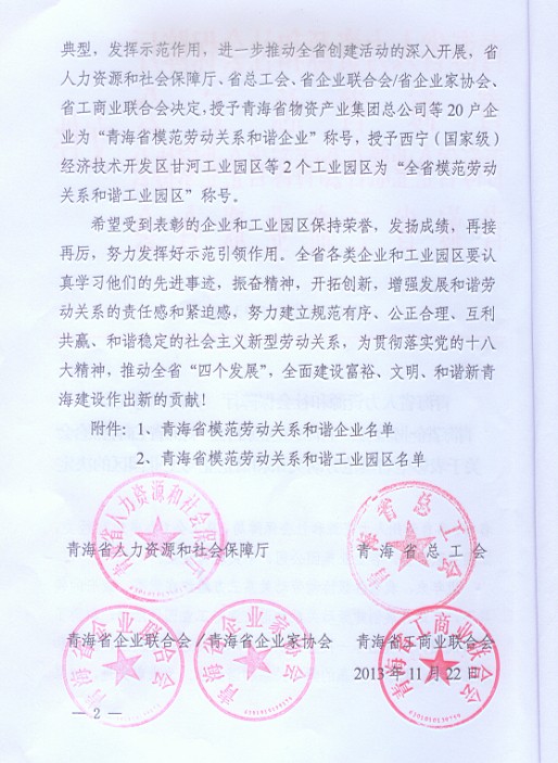 青海省物產(chǎn)集團(tuán)總公司榮獲“青海省模范勞動(dòng)關(guān)系和諧企業(yè)”稱(chēng)號(hào)