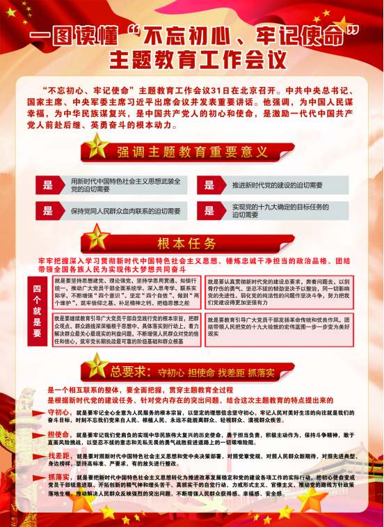 由集團黨委副書記、總經(jīng)理劉玲同志宣讀《集團黨委開展"不忘初心、牢記使命"主題教育實施方案》。集團黨委書記、董事長王玉輝同志作了"不忘初心、牢記使命"主題教育動員講話,對集團系統(tǒng)開展主題教育工作進行了安排部署,要求把主題教育與完成本單位轉型升級、項目建設、生產(chǎn)經(jīng)營等工作任務結合起來,切實把主題教育成果轉化為企業(yè)發(fā)展的強大動力,推動青海物產(chǎn)高質(zhì)量發(fā)展。省委"不忘初心、牢記使命"主題教育第十二巡回指導組組長任正德同志做了指導講話。充分肯定了集團黨委的前期工作,認為會議準備比較充分,有效統(tǒng)一了干部職工的思想,制定的主題教育《實施方案》操作性強,目標任務具體,動員講話政治站位高,思想認識深,工作思路清晰。同時,結合工作組的職責就落實主題教育各項任務講了六點意見。一是聚焦根本任務;二是把握"十二"字總要求;三是緊扣"五句話"總目標;四是落實"四個貫穿";五是抓實"六項重點"舉措;六是力戒形式主義,嚴禁主題教育走形式、走過場。